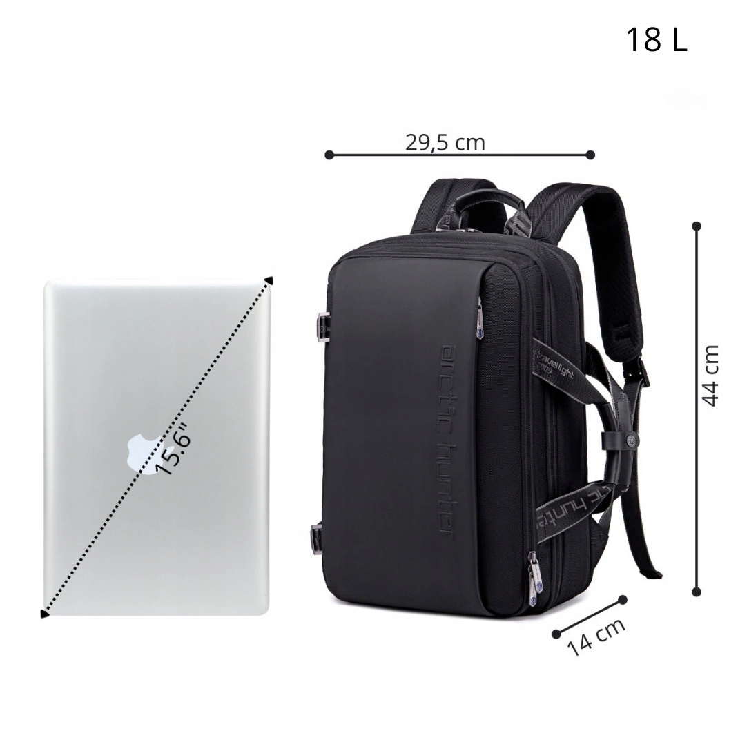 - Czarny plecak miejski podróżny biznesowy o pojemności 18 l i wymiarach 44×29,5×14 cm.