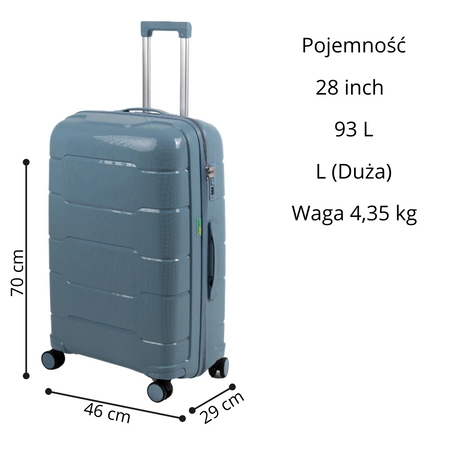 - Stylowa duża walizka podróżna w kolorze jasnoniebieskim, wykonana z wytrzymałego polipropylenu. Lekka, odporna na uszkodzenia i wilgoć, z zamkiem dla bezpieczeństwa bagażu. Idealna na loty i dłuższe wyjazdy. Wymiary: 70x29x46 cm, pojemność 93 L.