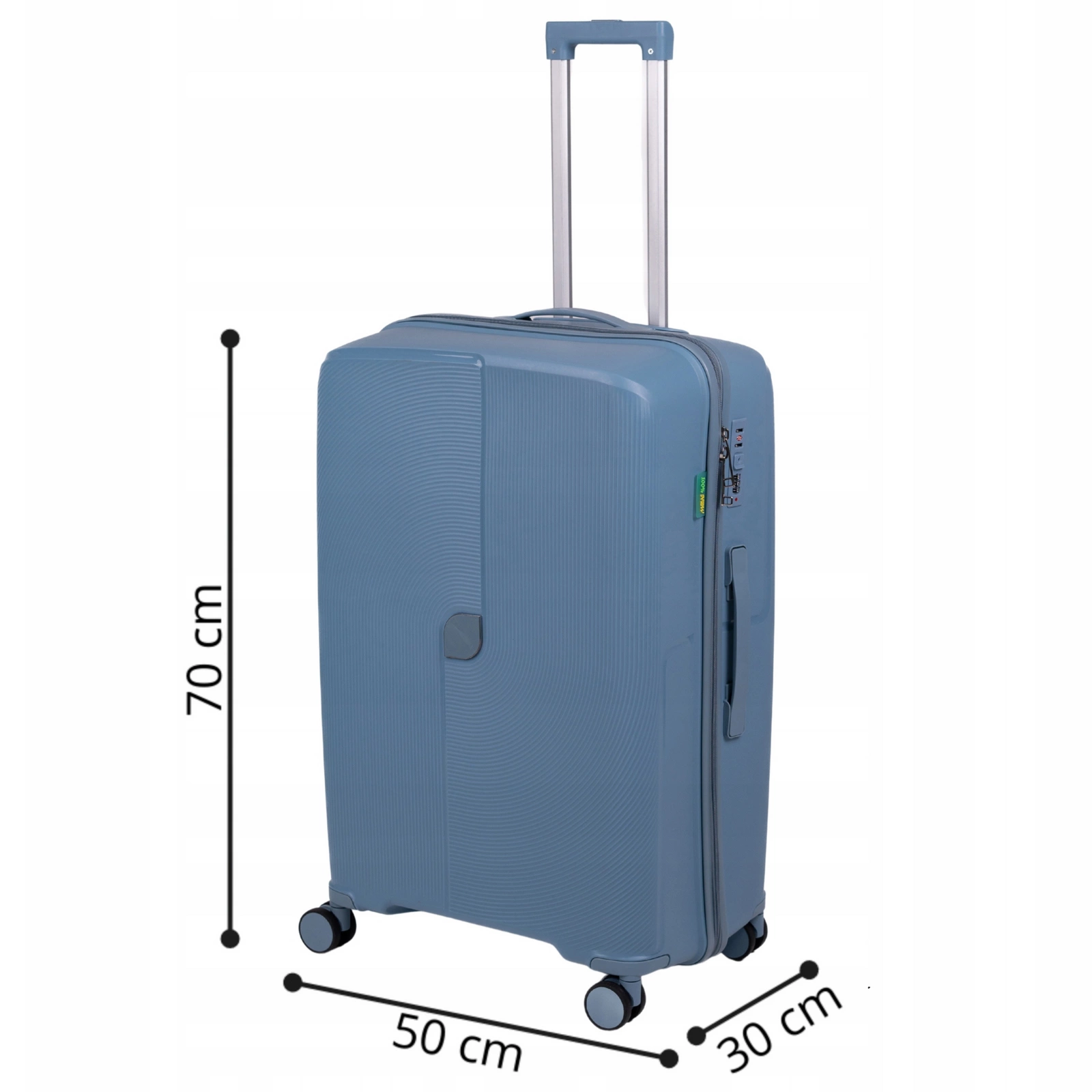 - Jasnoniebieska duża walizka podróżna z polipropylenu łączy elegancję z trwałością. Lekka, pojemna i odporna na uszkodzenia, idealna na wyjazdy lotnicze i wakacyjne. Wyposażona w zamek oraz praktyczne kółka. Wymiary 70x30x50 cm, pojemność 105 L.