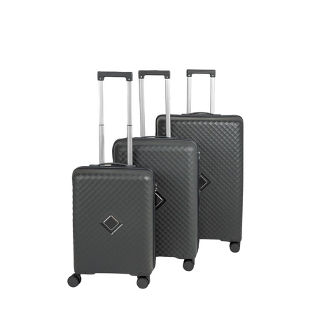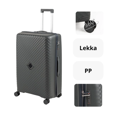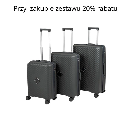 - Nowoczesny komplet trzech walizek w eleganckim ciemnoszarym kolorze. Wykonane z lekkiego i mocnego polipropylenu, odporne na uszkodzenia i wilgoć. Idealne na każdą podróż. Wymiary: S-50x38x22, M-60x44x28, L-70x49x31 cm.
