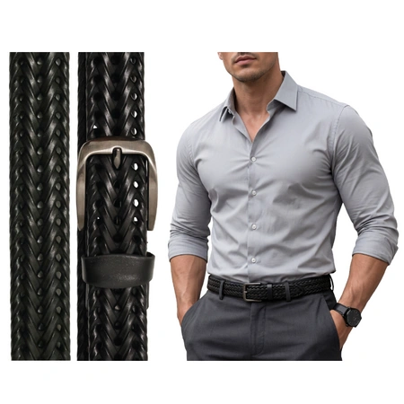 Czarny pasek pleciony to jeden z najbardziej uniwersalnych dodatków w męskiej garderobie. Łączy elegancję z nowoczesnym stylem, dzięki czemu świetnie wpisuje się w wiele codziennych i formalnych zestawów.
