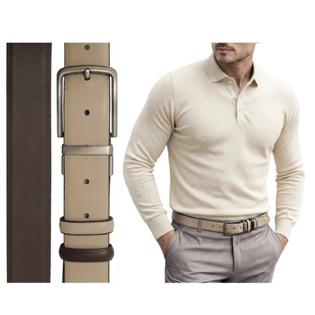 Dwustronny pasek brązowo–beżowy 2 w 1 to wyjątkowy upominek dla mężczyzny, który ceni eleganckie dodatki i praktyczne rozwiązania. Jego ciepłe, naturalne odcienie sprawiają, że doskonale komponuje się z wieloma stylizacjami — od casualowych zestawów po bardziej formalne, codzienne looki.