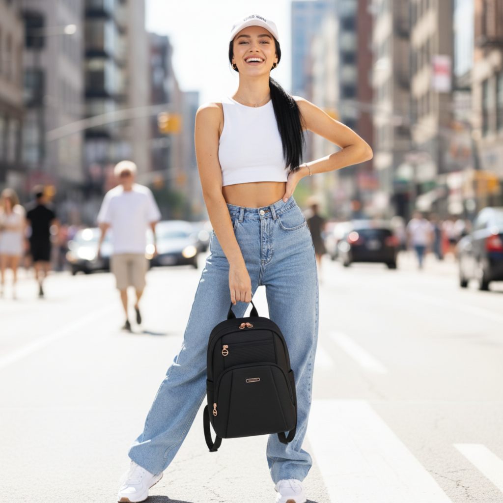 Ten czarny plecak damski to doskonałe połączenie stylu i funkcjonalności. Wykonany z materiału wodoodpornego, sprawdzi się o każdej porze roku – wiosną, latem, jesienią, a nawet zimą. Kompaktowy, lekki i wygodny, jest idealny dla każdej kobiety lub dziewczyny, która szuka eleganckiego i praktycznego dodatku do codziennego użytku.