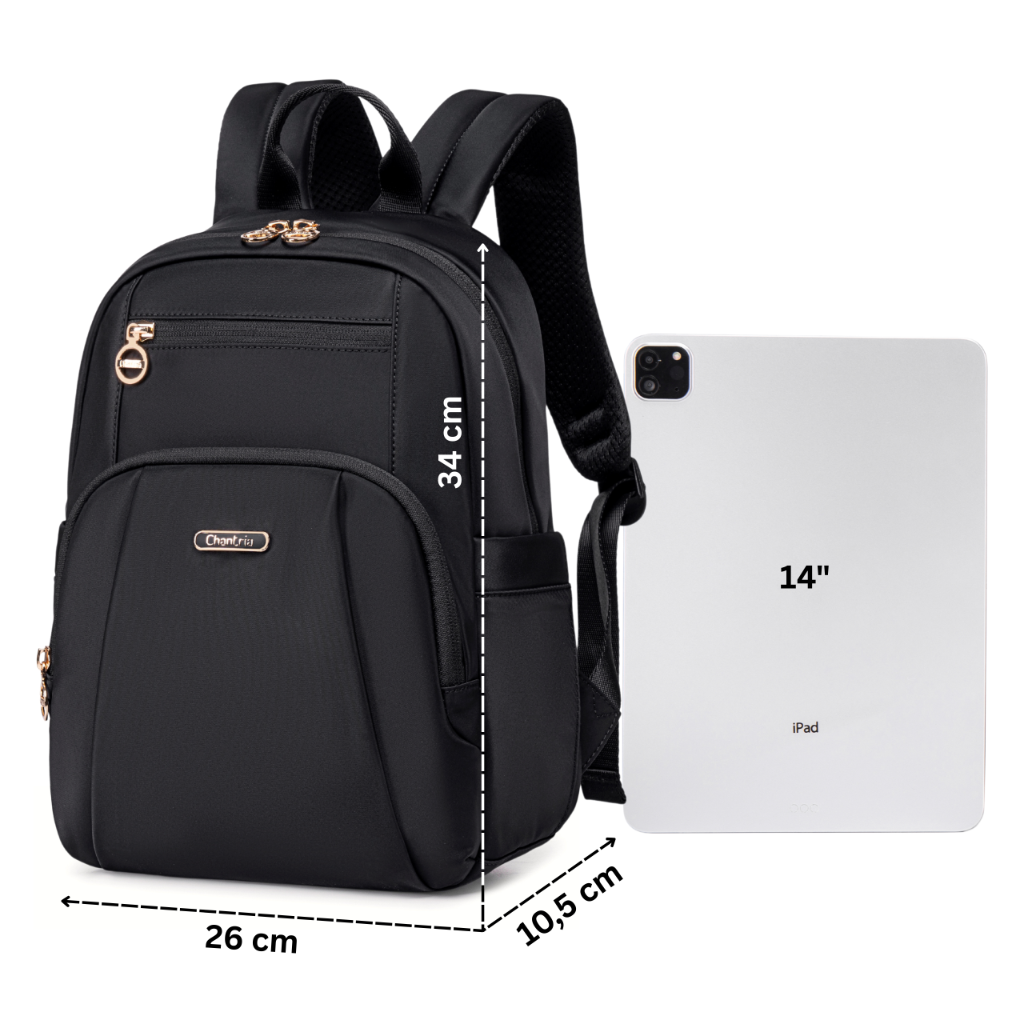 - Czarny plecak miejski damski o pojemności 9,3 l. Wymiary: 34×10,5×26 cm. Stylowy, wodoodporny i trwały. Ma przegrodę na iPada 10,9” oraz akcesoria. Idealny na studia i na co dzień, łączy elegancję z funkcjonalnością w nowoczesnym wydaniu.