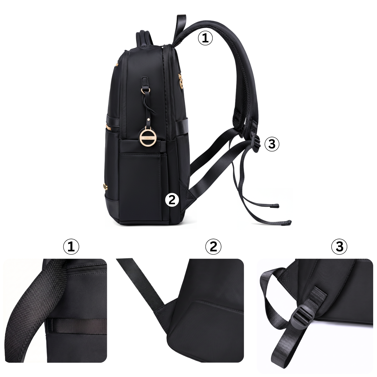Numery na zdjęciu prezentują kluczowe elementy konstrukcji czarnego plecaka, zaprojektowane z myślą o trwałości i wygodzie: