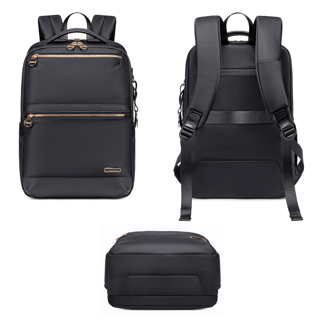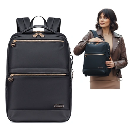 - Czarny plecak damski elegancki 13 kieszeni – idealny na uczelnię, do pracy i na co dzień. Trzyma formę, mieści laptopa 15,6". Solidny materiał, wygodne szelki i pasek mocujący. Stylowy i praktyczny wybór.