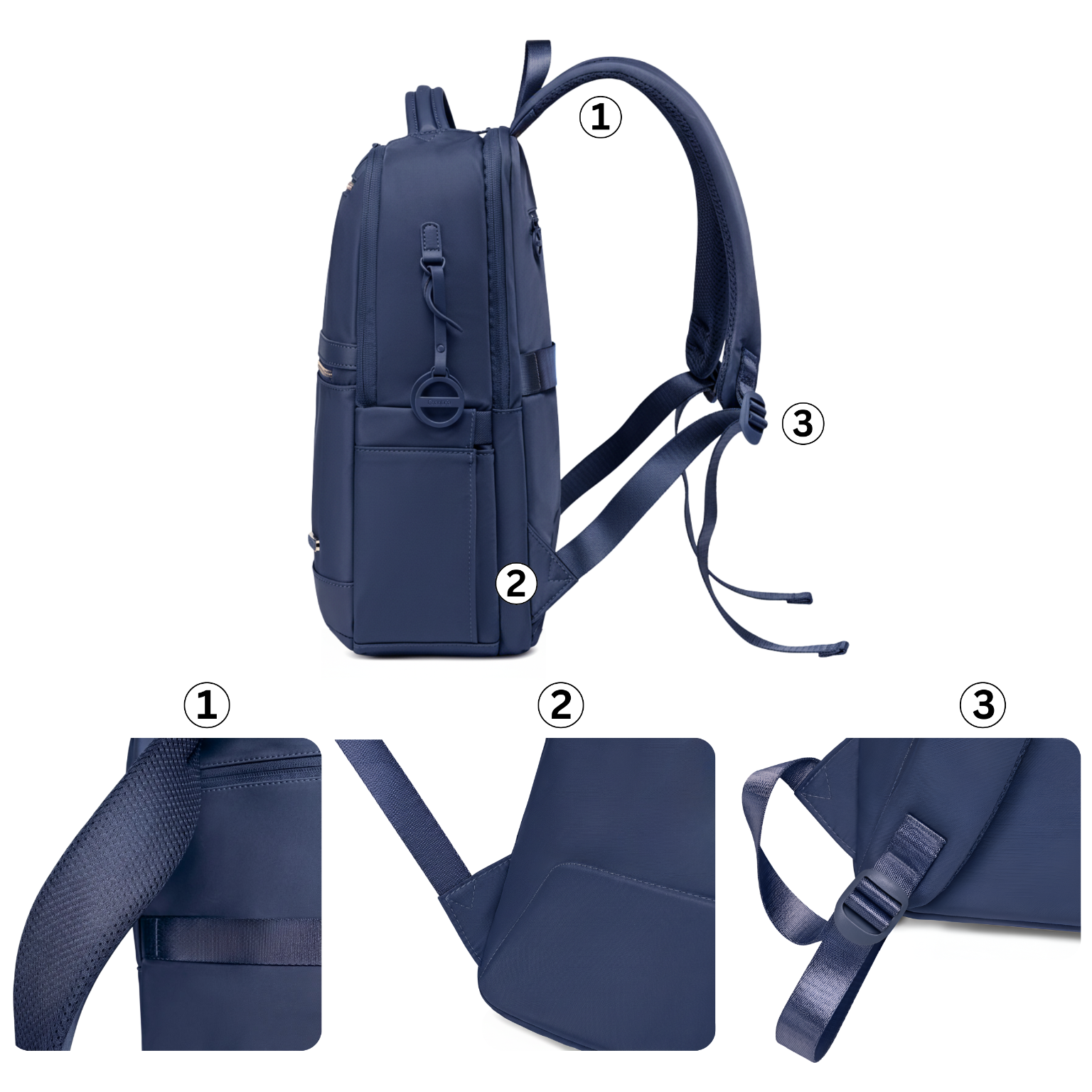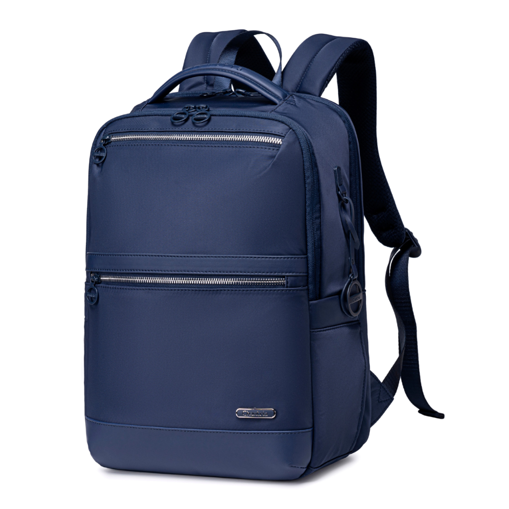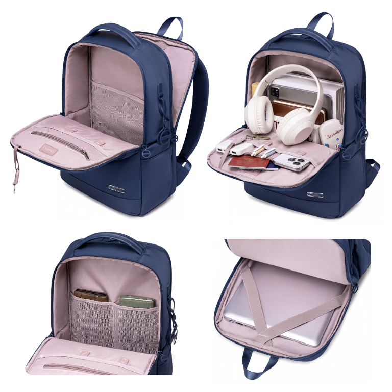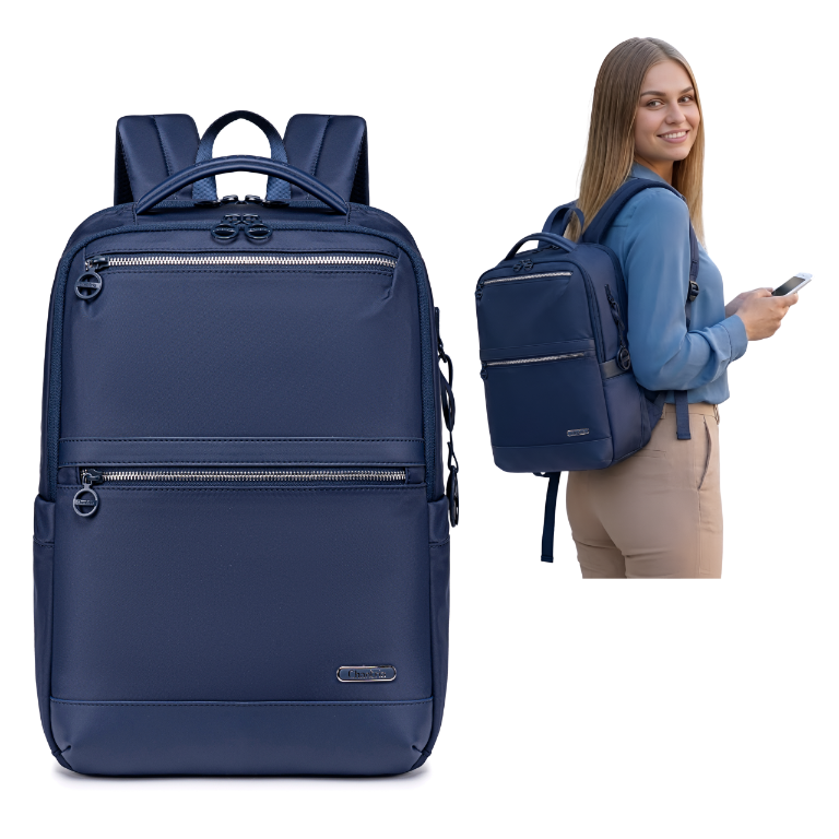• Ciemnoniebieski plecak damski miejski – 13 kieszeni, wodoodporny nylon i detale premium. Idealny na studia, do biura i w podróż. Pojemny, wygodny, z paskiem do walizki. Elegancki styl i codzienna funkcjonalność.