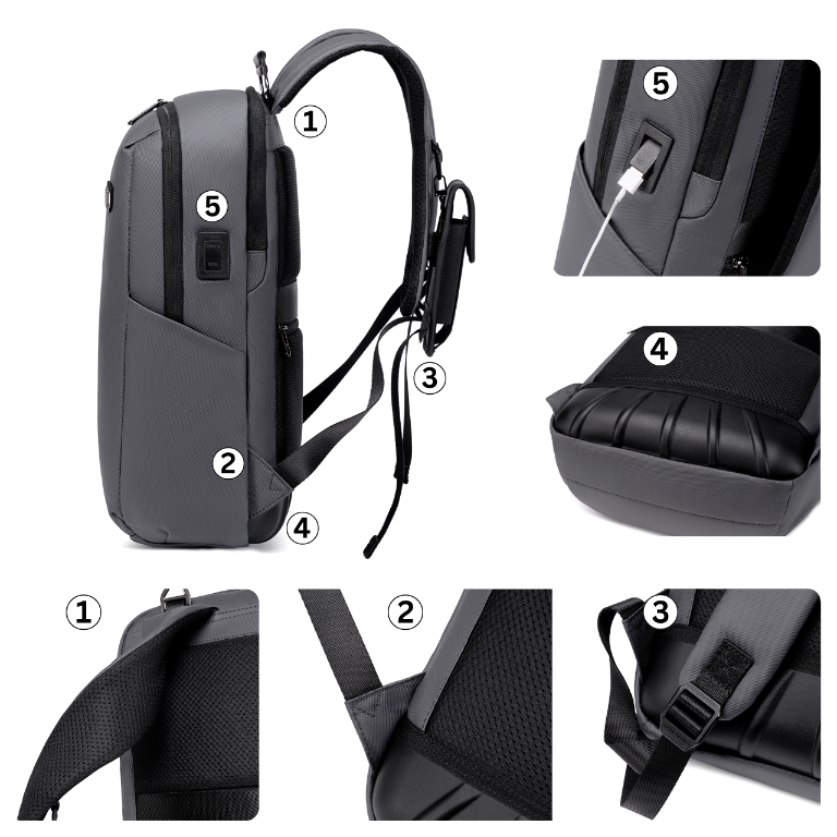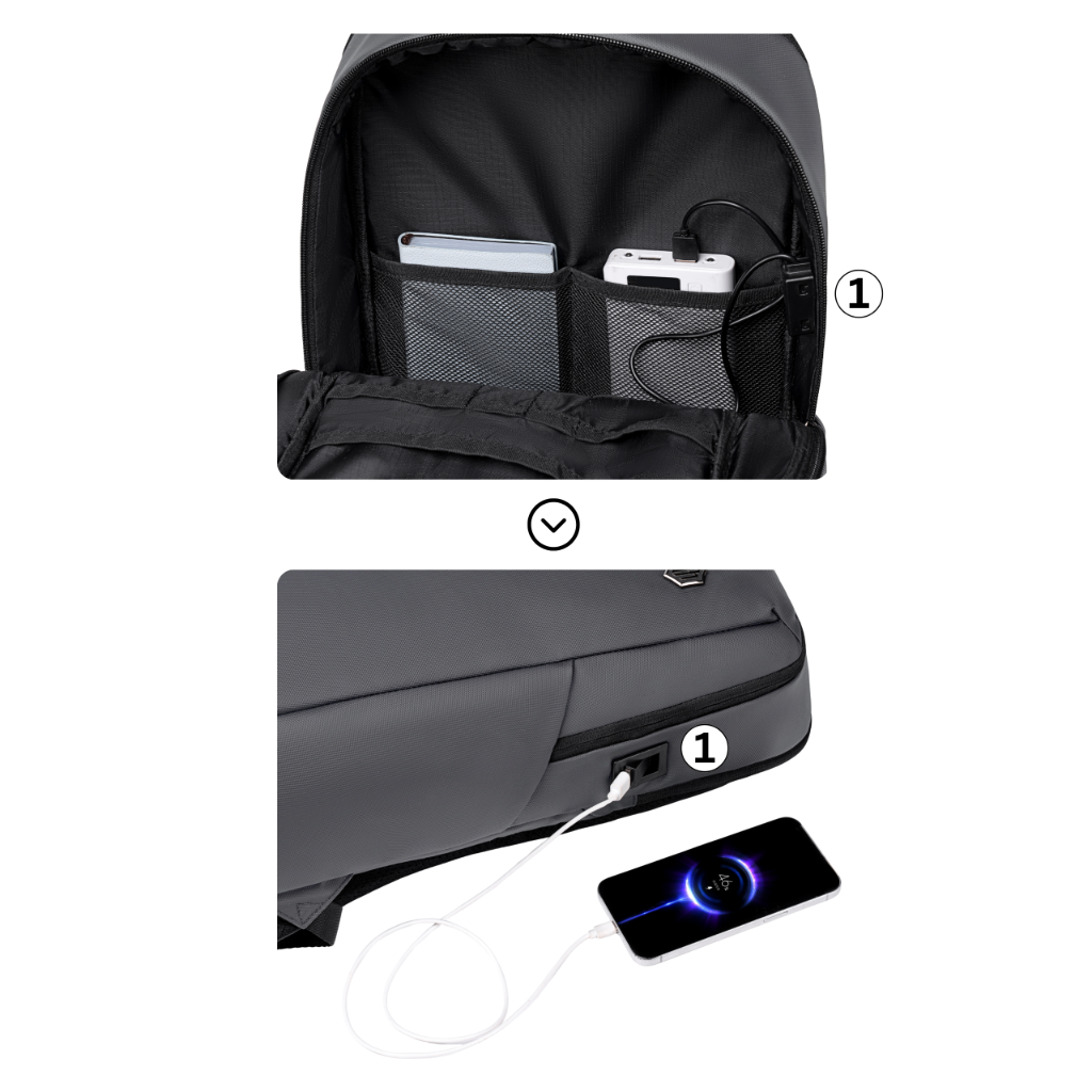 5️⃣ Zintegrowany port USB - Wbudowane wejście USB pozwala na wygodne korzystanie z powerbanka i ładowanie urządzeń bez konieczności otwierania plecaka.