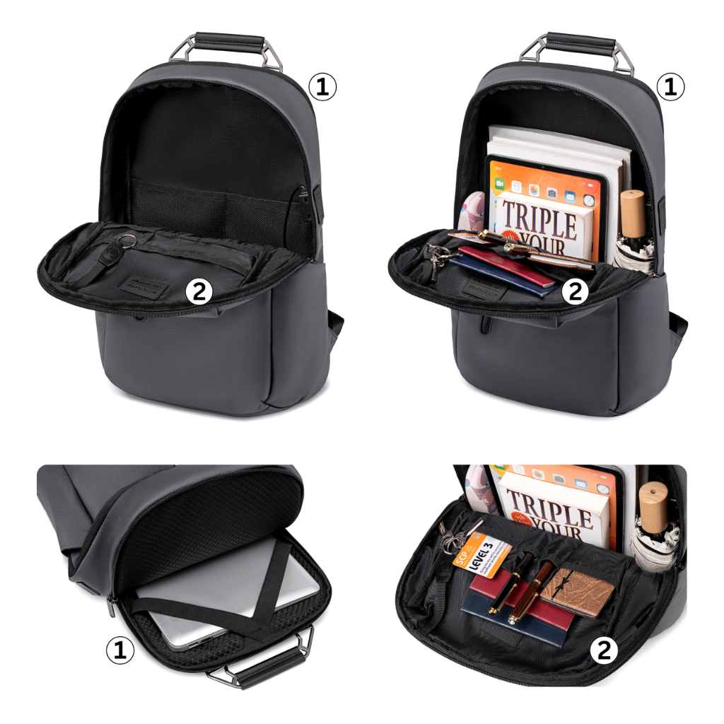 Szary plecak oferuje wygodne i intuicyjne wnętrze, które sprawdzi się w pracy, na uczelni i w miejskim stylu życia. Dwie oddzielne komory zapewniają komfort użytkowania i łatwą organizację.