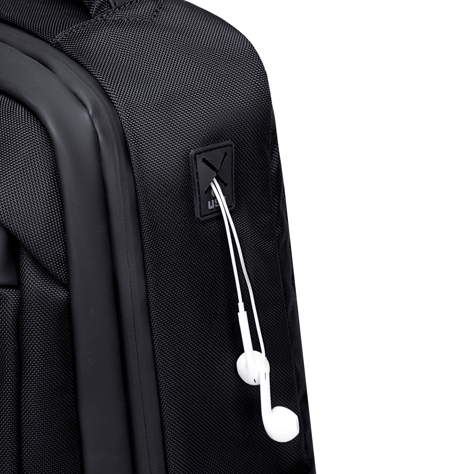 Plecak został wyposażony w nowoczesne rozwiązanie – boczne wejście na kabel, które pozwala wygodnie podłączyć telefon do powerbanka bez konieczności otwierania całej komory. To niewielki detal, który robi ogromną różnicę w codziennym użytkowaniu.
