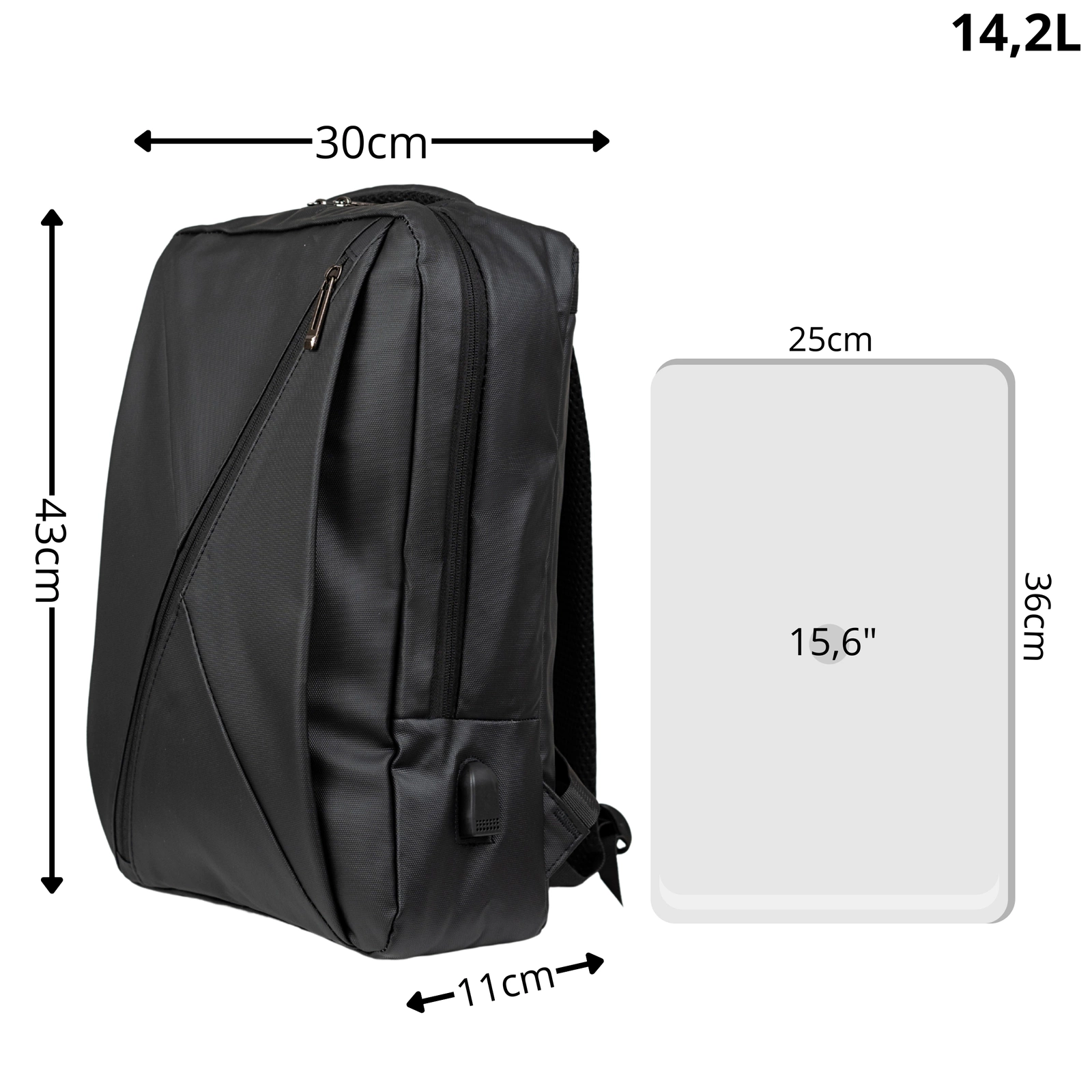 - Czarny plecak szkolny młodzieżowy z kieszenią na laptopa 15,6”, portem USB i 3 funkcjonalnymi kieszeniami. Lekki, pojemny 14,2L (43x30x11 cm),regulowane szelki i pasek do walizki. Idealny do szkoły, na studia, do pracy i podróży dla chłopaków i dziewczyn!