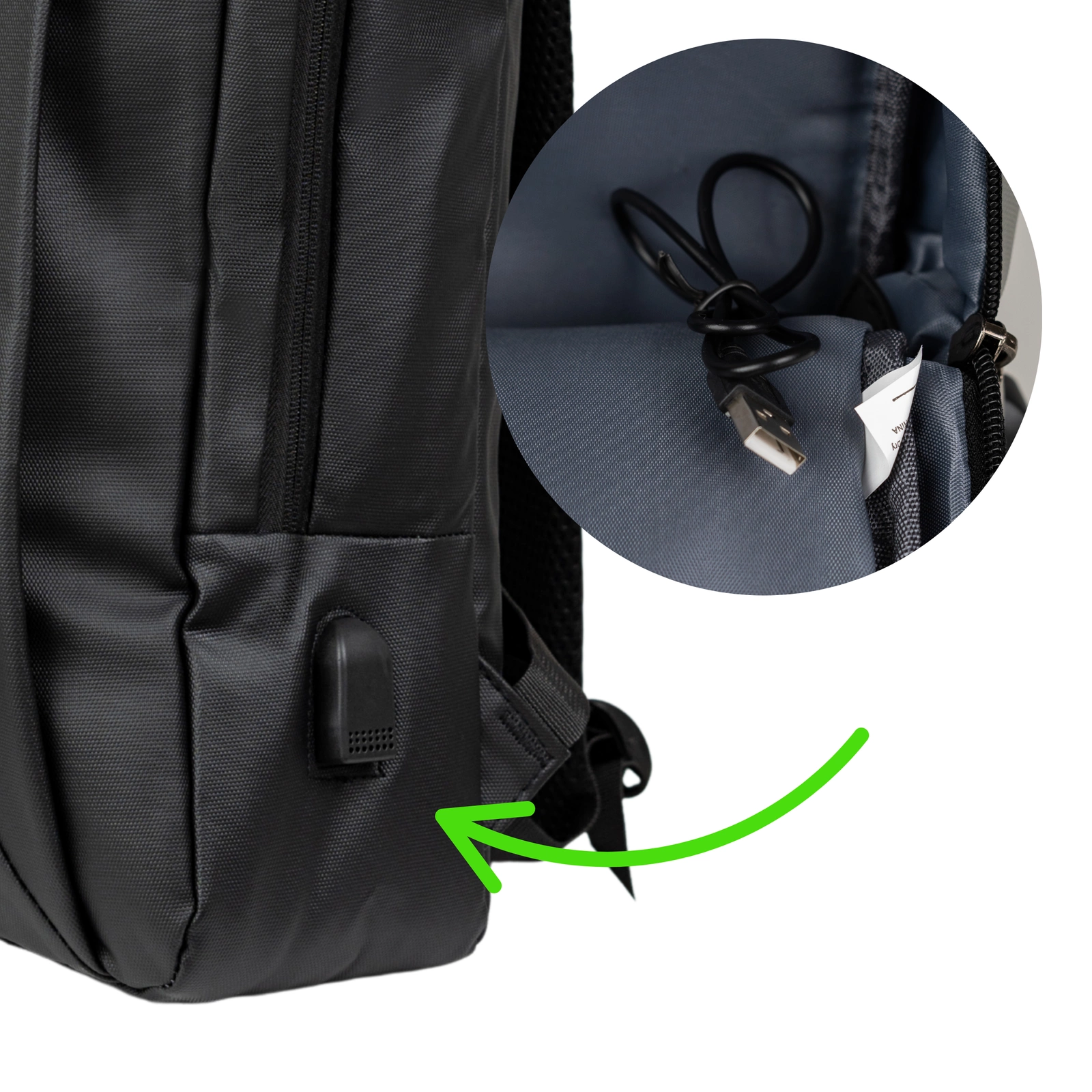 Czarny plecak VIO został wyposażony w zewnętrzny port USB z dołączonym kablem, który sprawia, że ładowanie telefonu czy innych urządzeń w drodze jest niezwykle wygodne. Wystarczy podłączyć powerbank wewnątrz plecaka, a Twój smartfon, słuchawki czy tablet będą zawsze gotowe do działania.