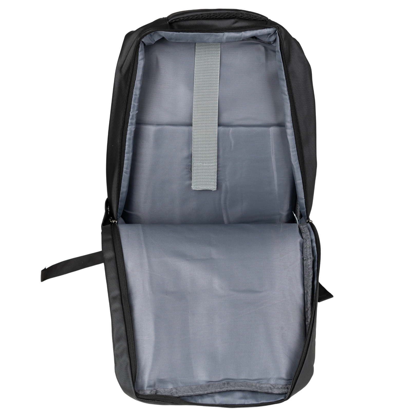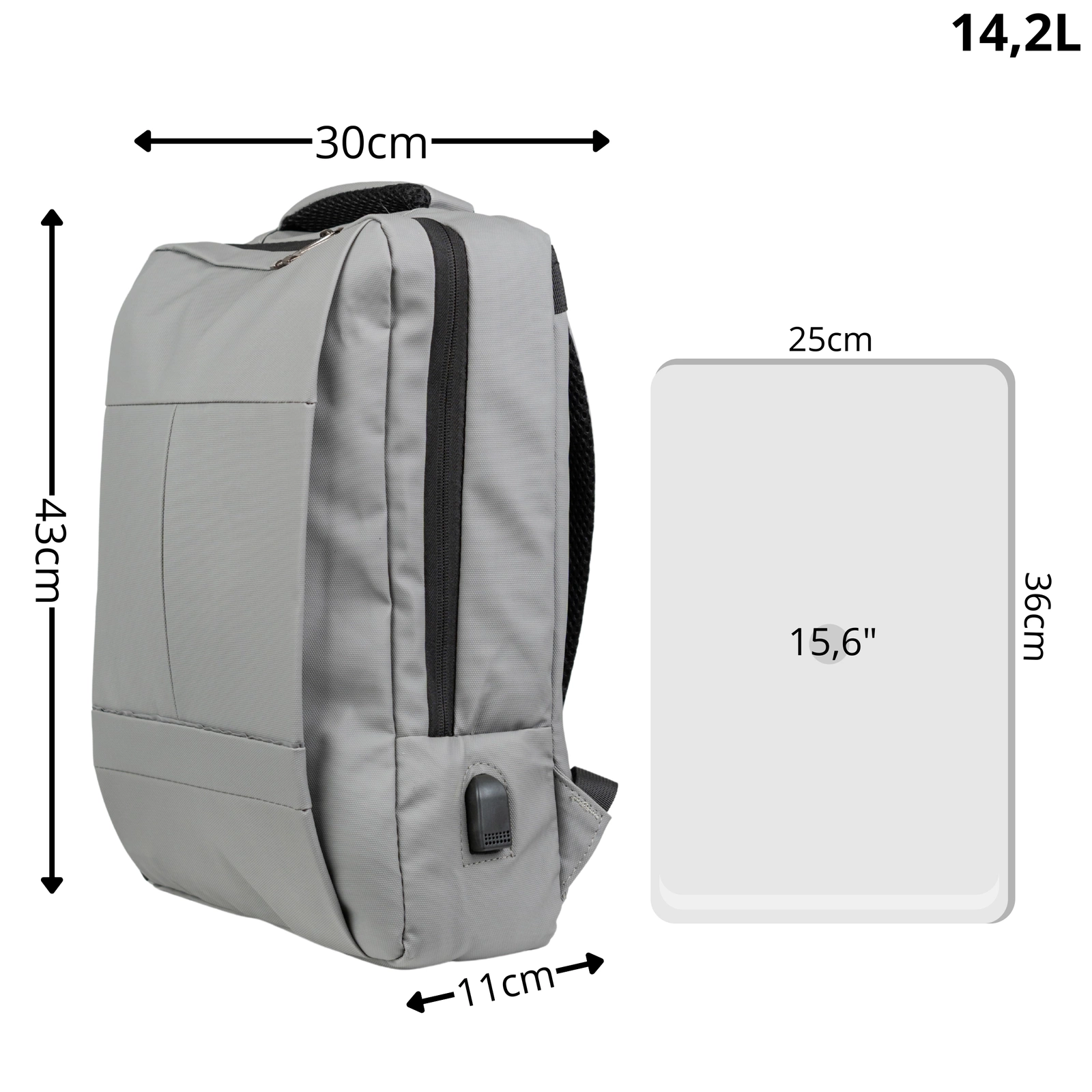 - Szary plecak szkolny młodzieżowy damski męski na laptopa 15,6” z portem USB i 3 kieszeniami. Pojemny 12,6L (42x30x10 cm), lekki, wygodny, z paskiem do walizki i solidnym poliestrem. Idealny do szkoły, na studia, do pracy i w podróże.