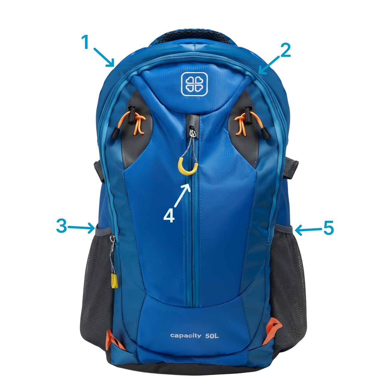 Na zdjęciu tego niebieskiego plecaka turystycznego zaznaczono detale techniczne, które wpływają na wygodę, stabilność i praktyczne użytkowanie plecaka:
