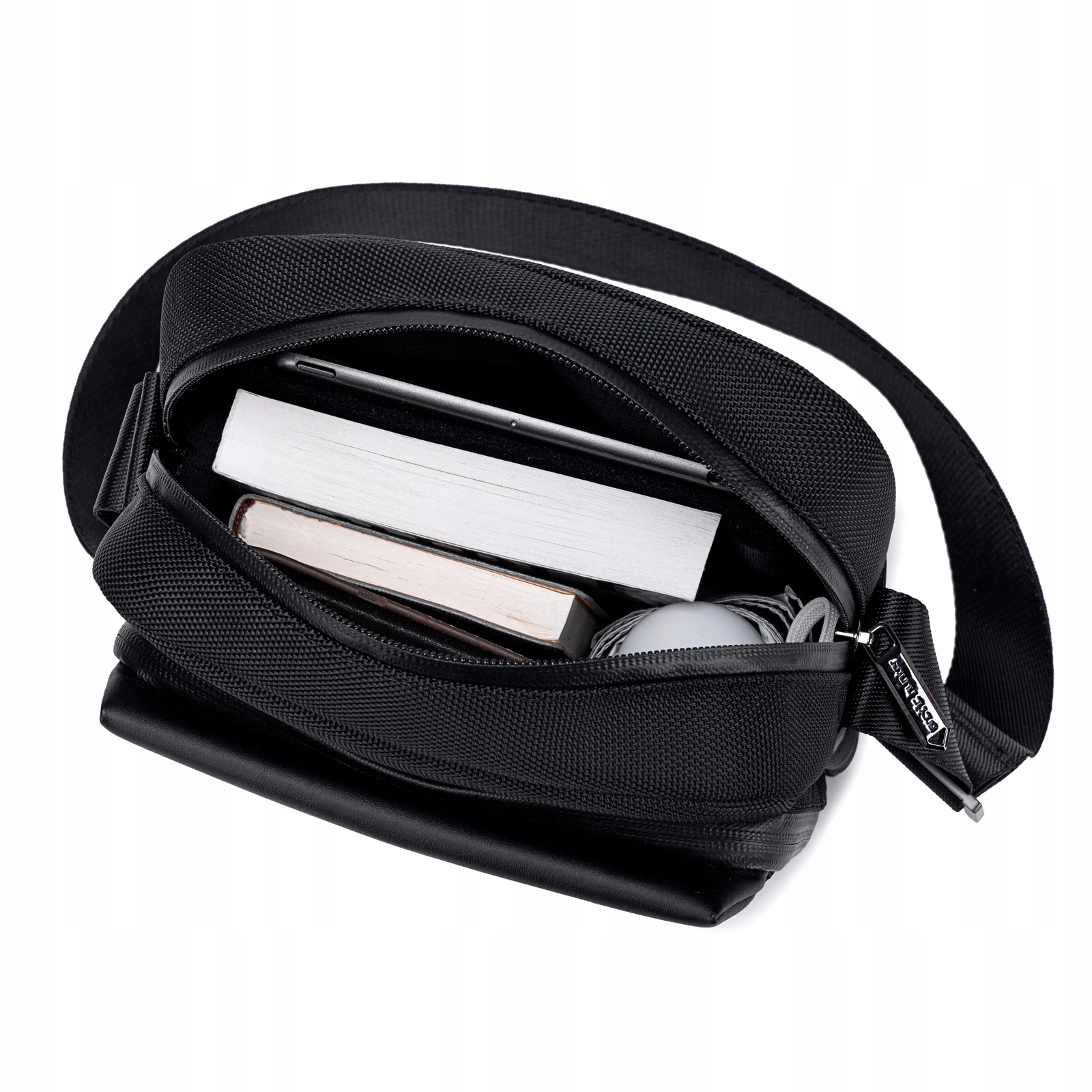 - Czarna saszetka męska na ramię to elegancka torba miejska, idealna na co dzień. W 6 kieszeniach z łatwością zmieścisz telefon, dokumenty, portfel czy mały tablet. Wodoodporny poliester i regulowany pasek gwarantują wygodę i trwałość. Wymiary: 25x19x7 cm.