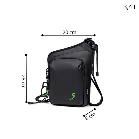 - Nowoczesna i praktyczna saszetka na ramię unisex w kolorze czarnym. Wodoodporna, lekka i stylowa – idealna na co dzień, do miasta i aktywności sportowych. Wyposażona w 3 kieszenie i regulowany pasek. Wymiary: 20×6×28 cm, pojemność 3,4 l.