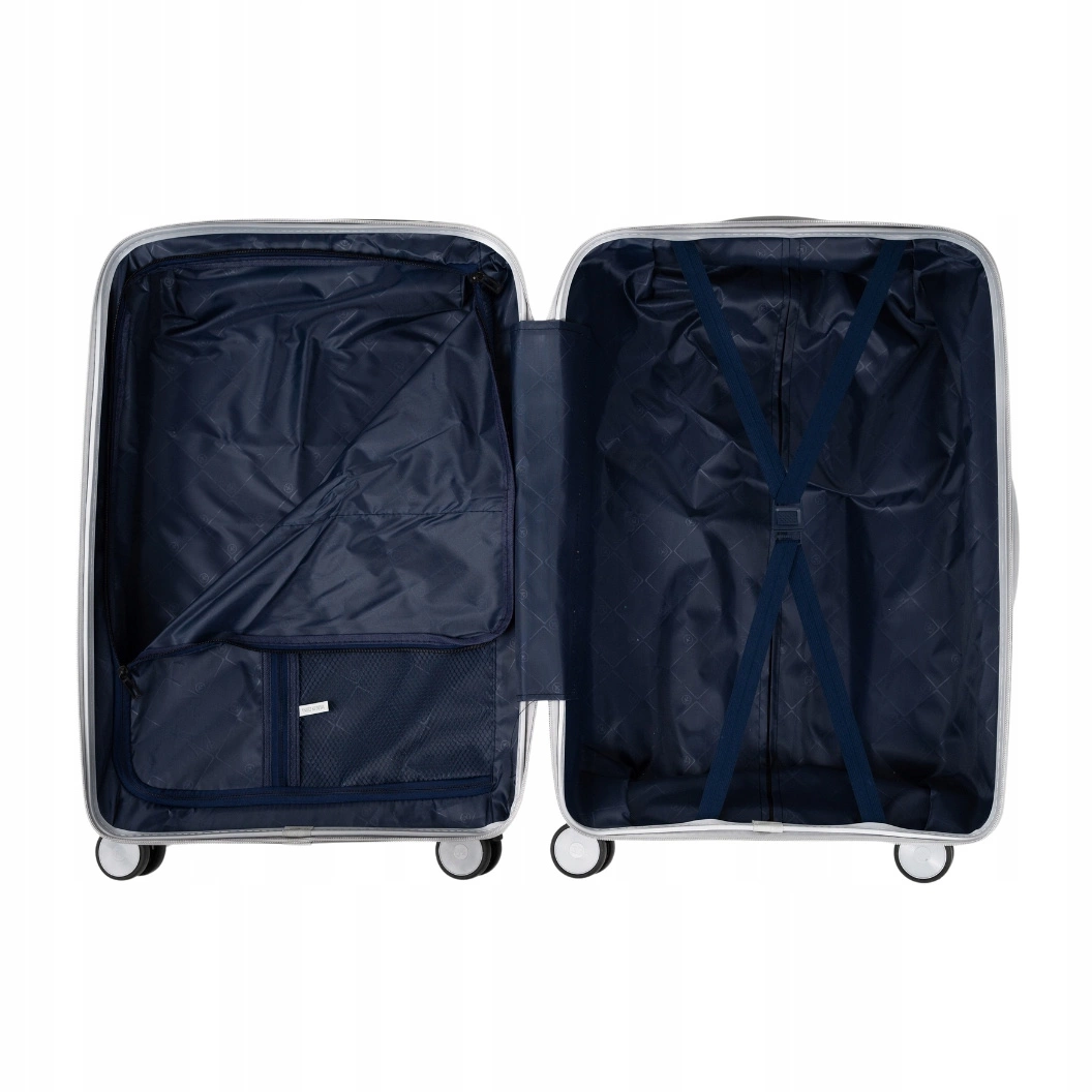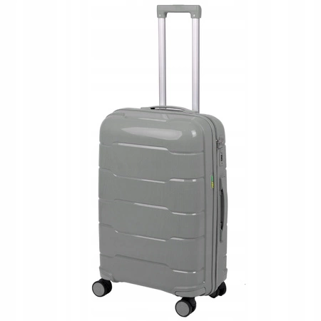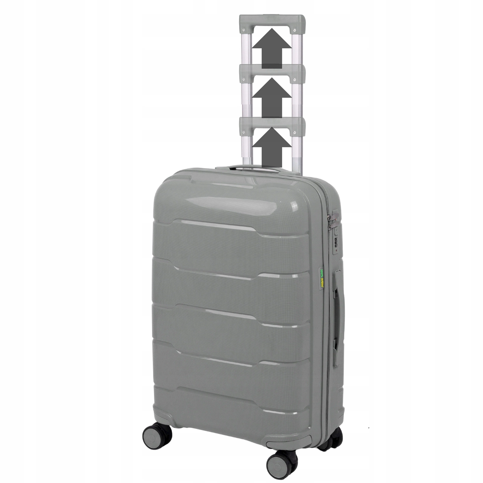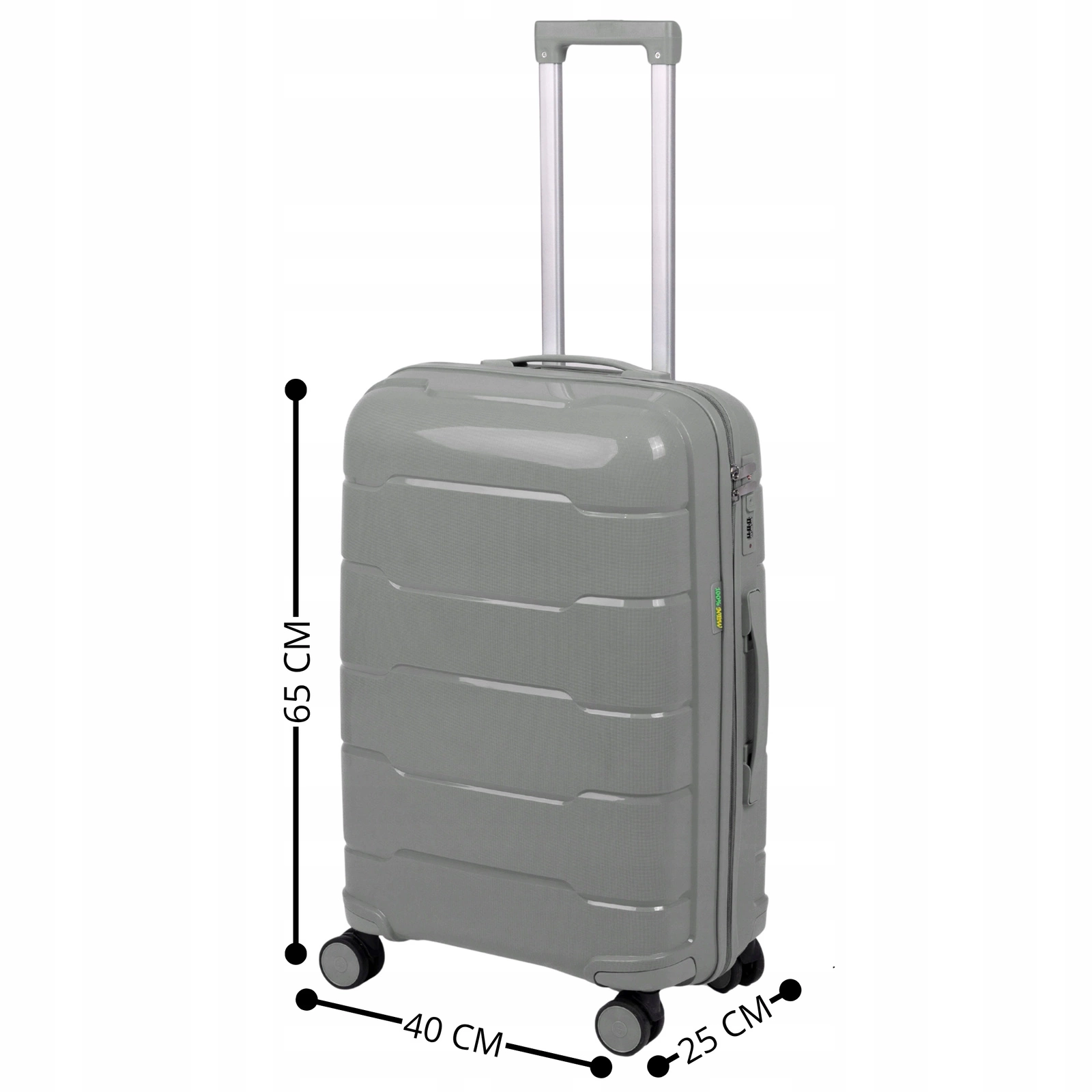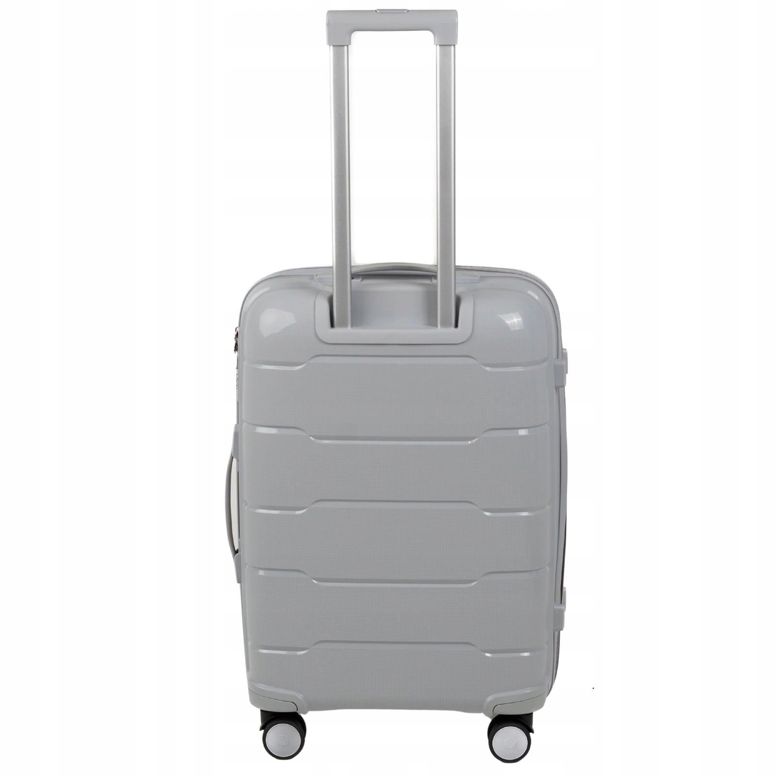 - Jasnoszara walizka średnia z PP – lekka i wytrzymała. Gładka skorupa łatwo się czyści. Wnętrze z pasami i kieszenią pomaga segregować rzeczy. Ciche koła 360° i regulowana rączka dają komfort. Wymiary Zewnętrzny: 60x26x40 cm. Pojemność: 69 L.