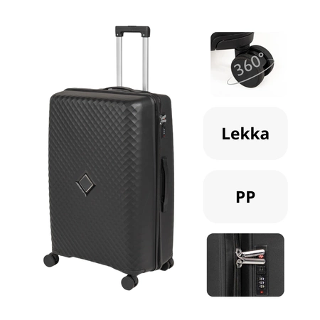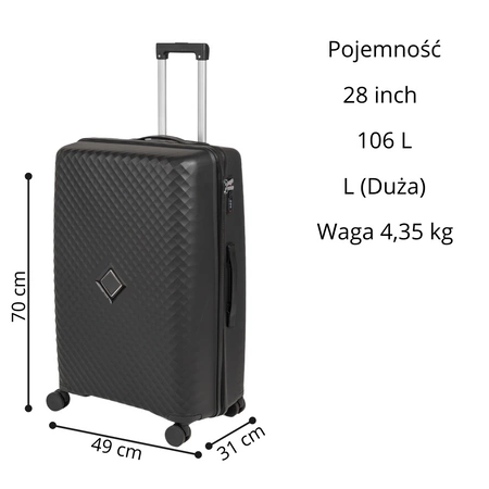 - Czarna walizka podróżna w dużym rozmiarze to połączenie elegancji i praktyczności. Wykonana z lekkiego, wytrzymałego polipropylenu, odporna na wilgoć i uderzenia. Idealna na dłuższe wyjazdy. Pojemność 106 L. Wymiary: 70x31x49 cm.