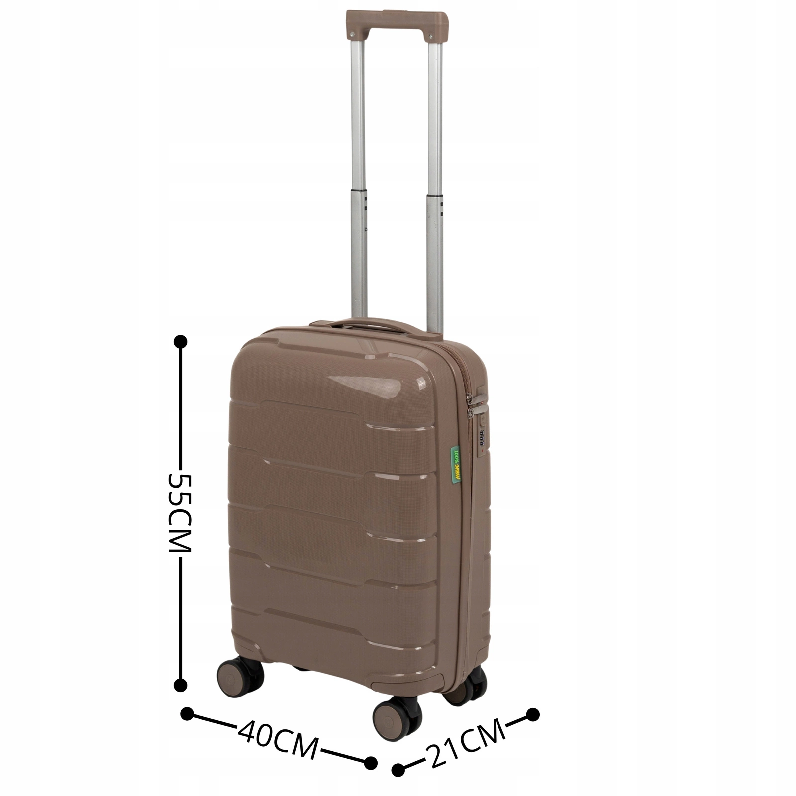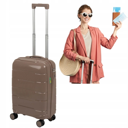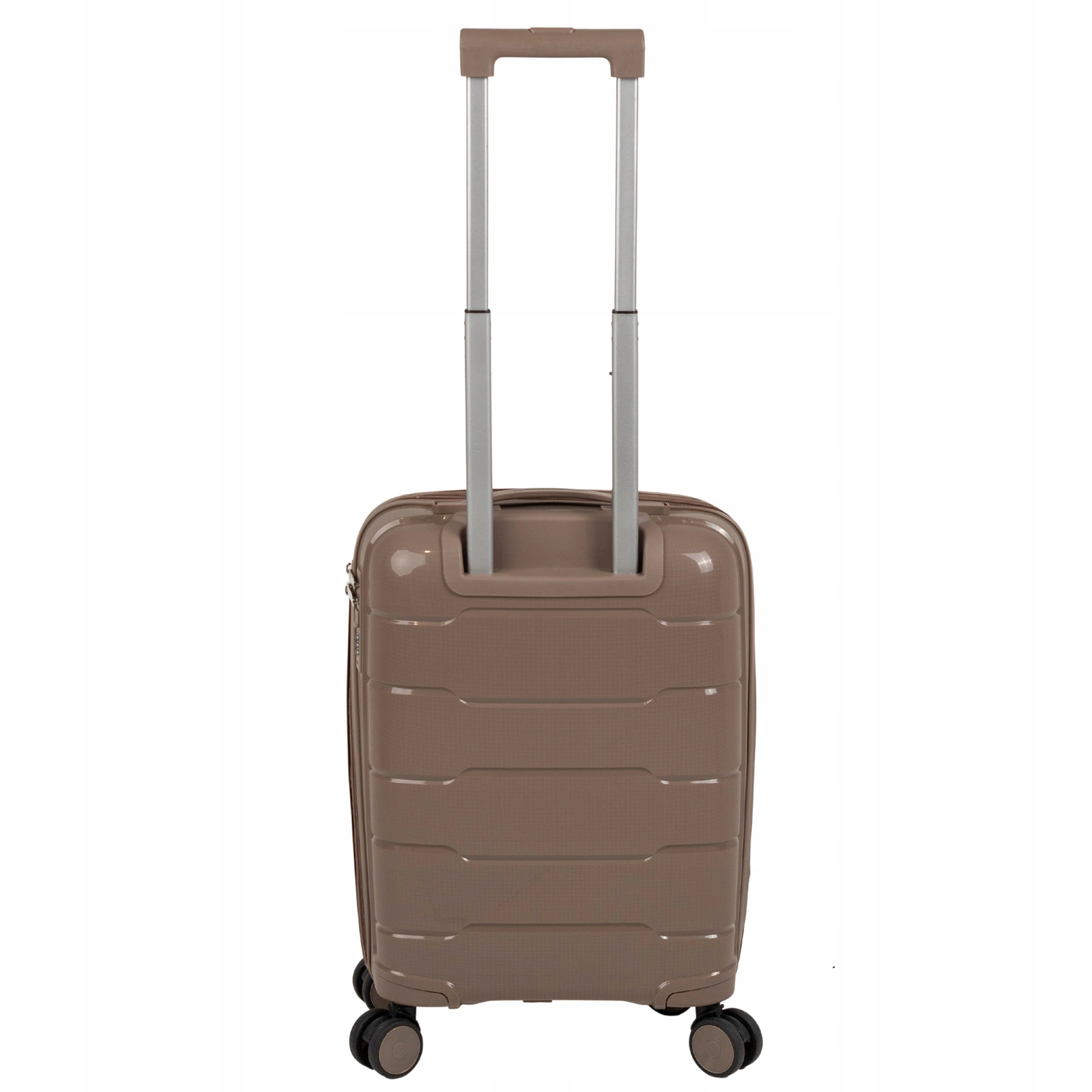 - Beżowa walizka mała – wykonana z trwałego PP, odporna na wilgoć i uderzenia. Lekka, elegancka i bardzo praktyczna. Posiada wnętrze z pasami i przegrodą. Idealna na podróże lotnicze. Wymiary: 48x21x38 cm. Pojemność: 40 L.