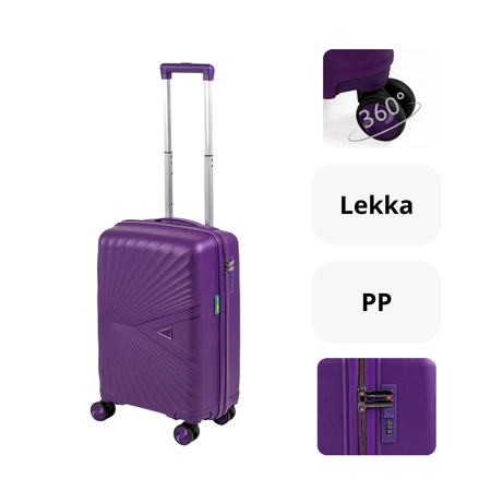 - Fioletowa walizka mała – wyjątkowy design i solidność. Lekka, odporna na uderzenia i temperaturę. Ciche koła 360° zapewniają pełną swobodę jazdy. Świetna na każdą podróż. Pojemność: 41 L. Wymiary: 50x36x23 cm.