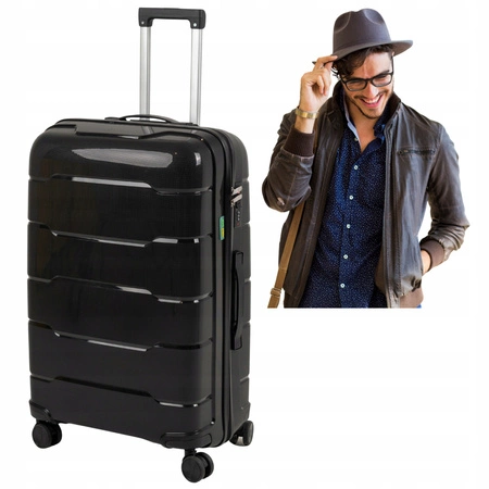 - Czarna duża walizka podróżna wykonana z polipropylenu – lekka, solidna i odporna na uszkodzenia. Stylowa i funkcjonalna, idealna na każdą podróż. Wyposażona w zamek i wygodne kółka, zapewnia bezpieczeństwo i komfort. Wymiary 70x29x46 cm, pojemność 93 L.