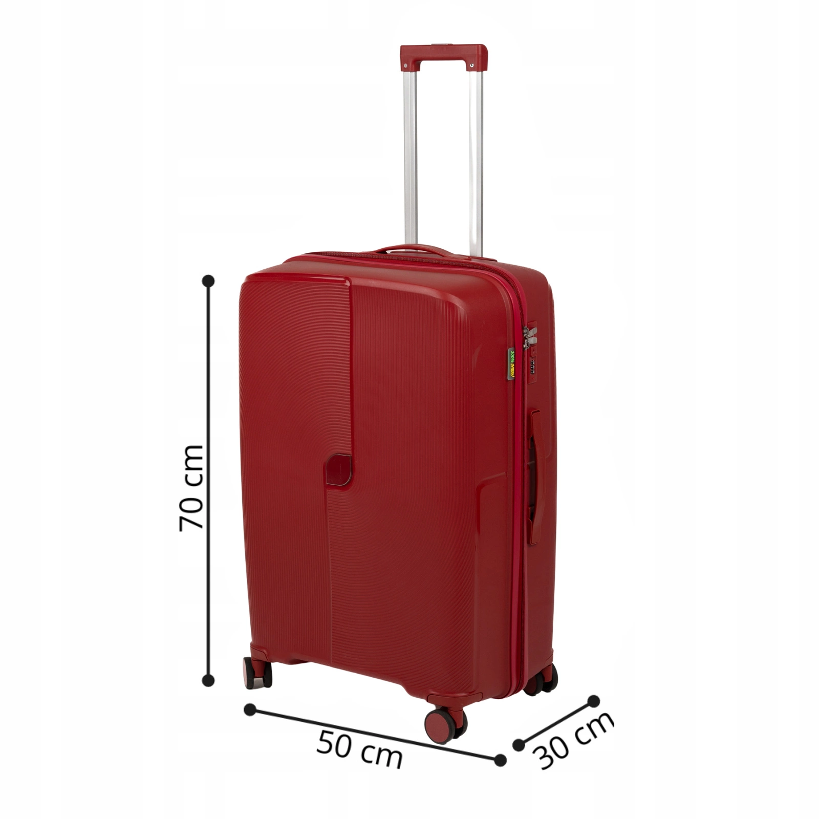 - Czerwona walizka podróżna z polipropylenu to połączenie stylu i funkcjonalności. Duża pojemność 105 L, trwały i odporny na uszkodzenia materiał, bezpieczny zamek oraz ciche kółka sprawiają, że idealnie sprawdzi się w każdej podróży. Wymiary 70x30x50 cm.