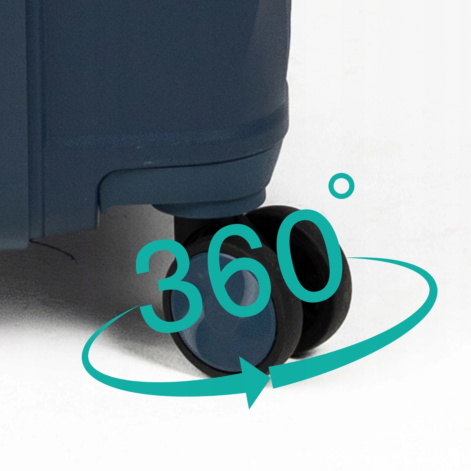 Nowoczesny system czterech obrotowych kółek z pełnym obrotem 360° to gwarancja pełnej kontroli nad walizką – możesz prowadzić ją obok siebie, przed sobą lub za sobą, bez konieczności dźwigania i obracania.