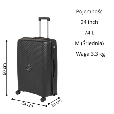 - Wytrzymała walizka średnia w kolorze ciemnoszarym, odporna na wgniecenia i wilgoć. Lekka konstrukcja i praktyczny zamek zapewniają wygodę pakowania i bezpieczeństwo rzeczy. Idealna na każdą podróż. Pojemność 74 L, wymiary 60x28x44 cm.