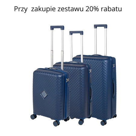 - Stylowy komplet trzech walizek w modnym ciemnoniebieskim kolorze. Wykonane z trwałego i lekkiego polipropylenu, odporne na zarysowania i wilgoć. Idealne na krótkie i długie wyjazdy. Wymiary: S-50x38x22, M-60x44x28, L-70x49x31 cm. Doskonałe na każdą podróż